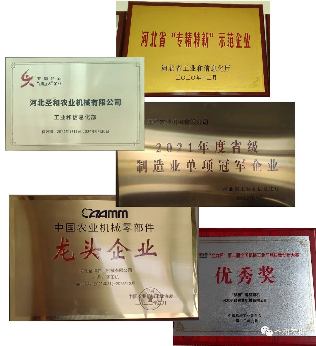 圣和公司為國家級專精特新“小巨人”企業、河北省“專精特新”示范企業,2021年入選河北省民營企業社會責任100強企業,河北省工業和信息化廳頒發的“2021年度省級制造業單項冠軍企業”。2022年圣和公司入選河北省首批縣域特色產業集群“領跑者”企業名單;2022年圣和牌旋耕機和還田機全國銷量第一;2023年中國機械工業聯合會第二屆全國機械工業產品質量創新大賽圣和牌旋耕機榮獲“優秀獎”;中國農業機械工業協會評選為2023-2026年度“中國農業機械零部件龍頭企業”。