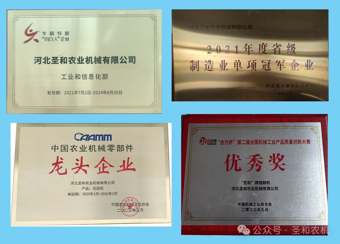 公司被授予國家級專精特新“小巨人”企業、河北省“專精特新”示范企業、河北省耕作機械技術創新中心依托單位、省級制造業單項冠軍企業、河北省首批縣域特色產業集群“領跑者”企業名單。身處行業當中,圣和公司積極參與和承擔行業、協會等發起各項產品的標準起草編寫工作,推動了行業發展。