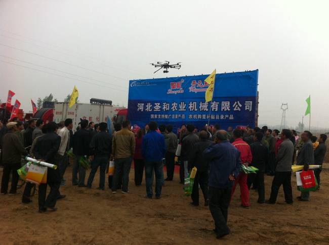 同時,在深松演示會上我公司同西安鯤化航空科技有限公司聯(lián)合研制的“農(nóng)用植保噴藥無人飛機”成為了此次演示會的一大亮點,本公司此次共攜帶二架無人飛機進行演示,一架做為農(nóng)用噴藥,進行實地演示;一架做為航空航拍,全程跟蹤拍攝演示會現(xiàn)場;各企業(yè)代表及農(nóng)民用戶給予了圣和公司高度。
