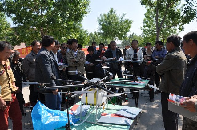 5月5日,我公司與西安鯤化聯(lián)合研制的無人植保飛機(jī)在晉州登場(chǎng)亮相,此次參觀試驗(yàn)的有晉州市劉市長(zhǎng)、石家莊市植保站王維蓮站長(zhǎng)、我公司董事長(zhǎng)王新芳、威遠(yuǎn)生化植保營銷中心總經(jīng)理應(yīng)曉東等公司領(lǐng)導(dǎo)及當(dāng)?shù)卮迕窈秃献魃?0多人觀摩;在本次試驗(yàn)會(huì)上,展示的無人飛機(jī)一個(gè)用于小麥藥效防治工作、一個(gè)用于全程跟蹤航拍工作。