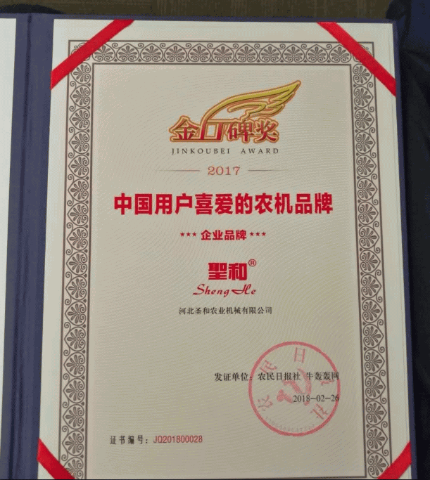 圣和公司等全國(guó)30個(gè)產(chǎn)品品牌分別獲得“中國(guó)用戶喜愛(ài)的農(nóng)機(jī)品牌”榮譽(yù)稱號(hào),并上臺(tái)領(lǐng)獎(jiǎng)。圣和代表發(fā)言:獲獎(jiǎng)是全體圣和人辛勤耕耘的碩果,但獲獎(jiǎng)只是代表過(guò)去。圣和人要把今天的成就作為明天繼續(xù)進(jìn)步的動(dòng)力,不斷創(chuàng)新產(chǎn)品,不斷提升質(zhì)量,為國(guó)家鄉(xiāng)村振興大業(yè)精心發(fā)力,農(nóng)民的期待是我們的發(fā)展方向。