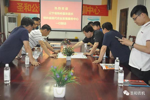 公司董事長王新芳先生及團隊熱情接待,并在公司會議室交流探討。公司董事長王新芳致歡迎詞,介紹了企業概況、發展理念和發展目標,雙方在祥和氣氛中對南北各地農業農藝及農民對農機具的市場需求和現狀差異與發展,尤其對東北當地現狀與發展前景進行深入探討。