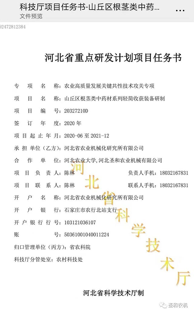 河北省重點研發計劃項目:山丘區根莖類中藥材系列輕簡收獲裝備研制項目,由河北省農業機械化研究所有限公司承擔,河北農業大學與河北圣和農業機械有限公司為合作單位。 本次會議河北省農業機械化研究所所長范國昌,河北圣和農業機械有限公司董事長王新芳等參加了會議。會議明確了工作計劃進度,細化了工作任務,為項目的順利開展打下了基礎。