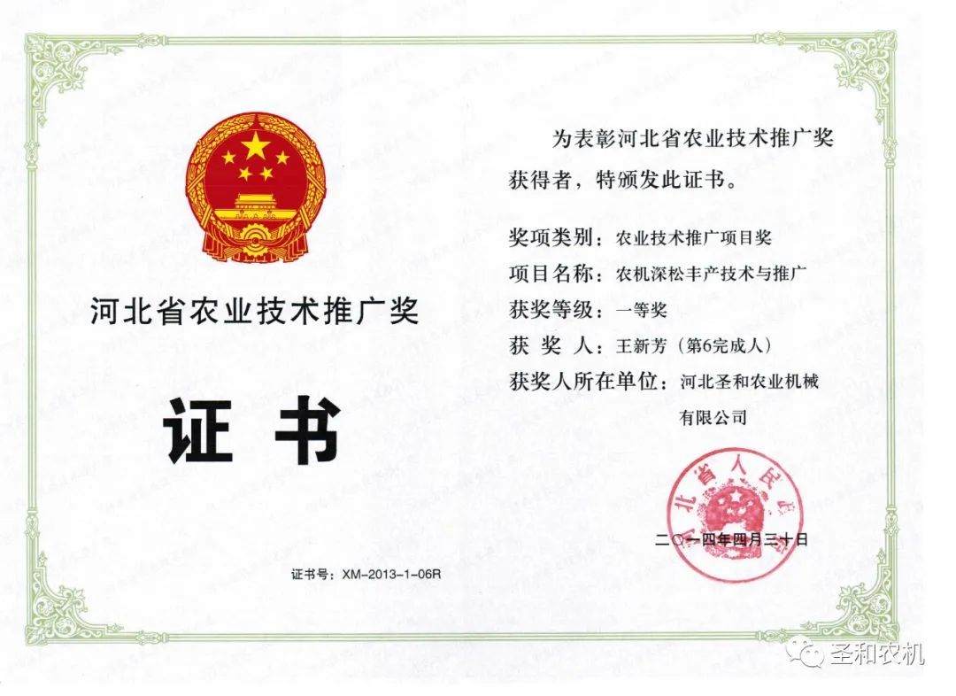 ●2016年,圣和公司研發(fā)中心被邢臺市科技局認(rèn)定為“邢臺市大田耕種機(jī)械工程技術(shù)研發(fā)中心”。