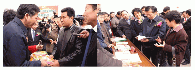 陳曉華來到農(nóng)業(yè)部農(nóng)機鑒定總站咨詢臺察看宣傳資料,當(dāng)看到《2009年—2010年國家支持推廣的農(nóng)業(yè)機械產(chǎn)品目錄》《假冒偽劣農(nóng)機產(chǎn)品表現(xiàn)形式和判斷方法》《農(nóng)機用戶購機指南》等宣傳資料時,高興地對在站在身邊的農(nóng)業(yè)部農(nóng)機鑒定總站國彩同副書記說:“這幾本宣傳資料都很好,國家今年上百億的農(nóng)機補貼需要農(nóng)機部門好好幫助農(nóng)民把好產(chǎn)品質(zhì)量關(guān),這本《農(nóng)機用戶購機指南》小冊子實用還方便,購機農(nóng)民應(yīng)該會喜歡。”“總站已連續(xù)8年編印了《農(nóng)機用戶購機指南》,每年的‘3·15’我們都放免費發(fā)給農(nóng)民朋友,很受歡迎。”農(nóng)業(yè)部農(nóng)機化管理司副司長劉憲介紹道。
